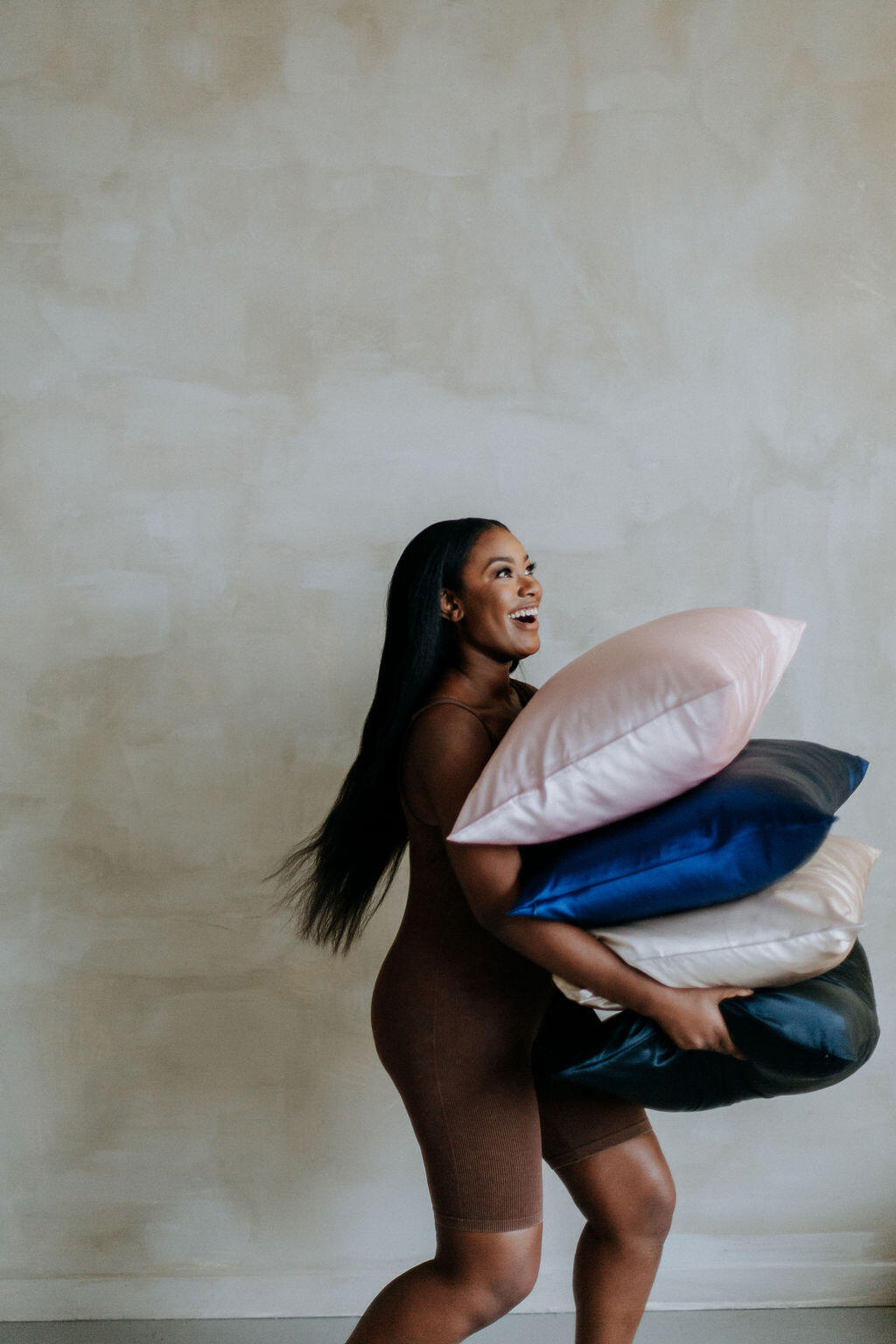 Lavez les taies d'oreiller en soie à l'envers à la main dans de l'eau froide OU lavez-les à la machine à l'eau froide sur le cycle délicat/en mode soie