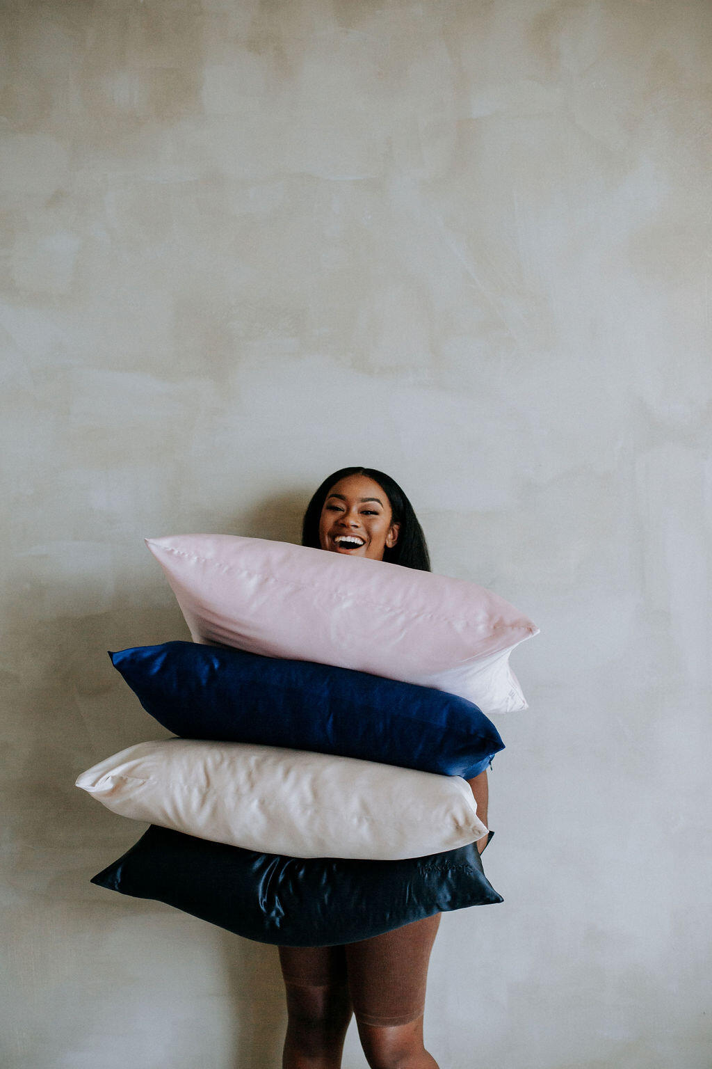 Lavez les taies d'oreiller en soie à l'envers à la main dans de l'eau froide OU lavez-les à la machine à l'eau froide sur le cycle délicat/en mode soie